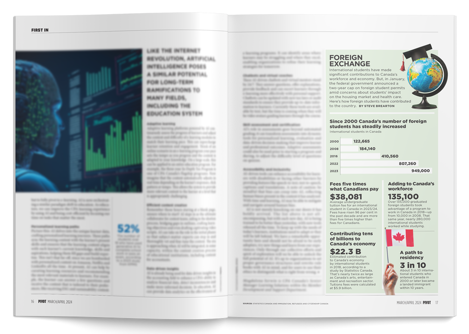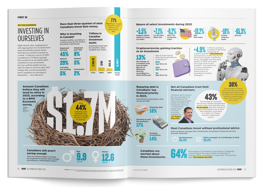 Infographics are always a fun way to break down complex topics into manageable, bite-sized info to educate readers. During my time with PIVOT, I created infographics—both big and small—to illustrate a variety of informative topics that would otherwise be difficult to understand. Here, I play with hierarchy, typography, conceptual photography, scale and information systems so that readers better understand the numbers behind cutting-edge news.